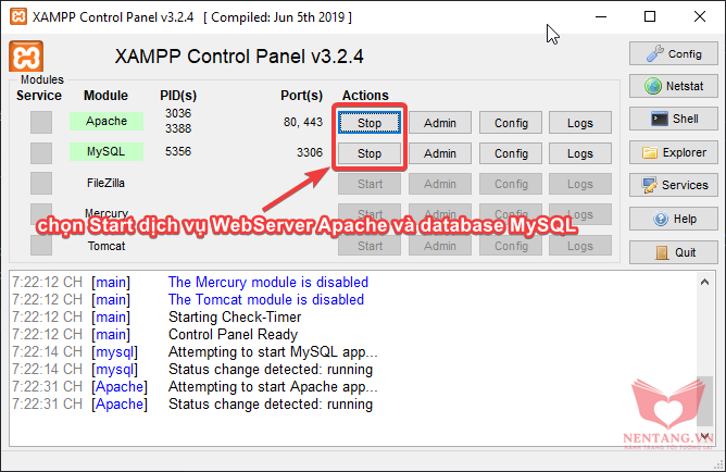 Start->XamppStart dịch vụ WebServer ApacheStart dịch vụ Database MYSQL