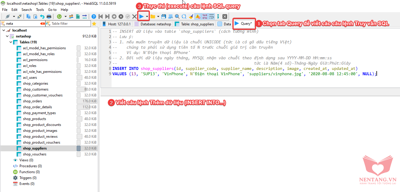Step 2: thực thi (Execute) câu lệnh SQL query trong HeidiSQL
