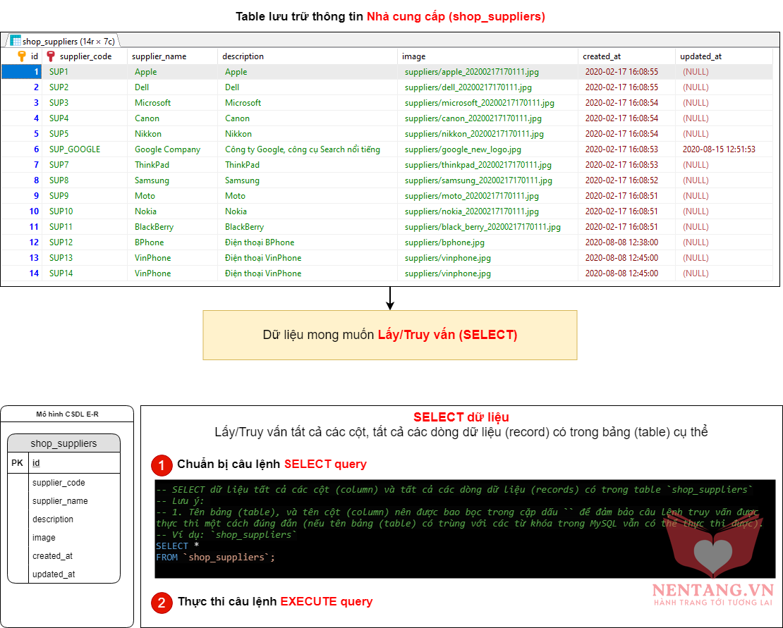 Ví dụ 1: Lấy/Truy vấn tất cả các cột và các dòng dữ liệu có trong table shop_suppliers