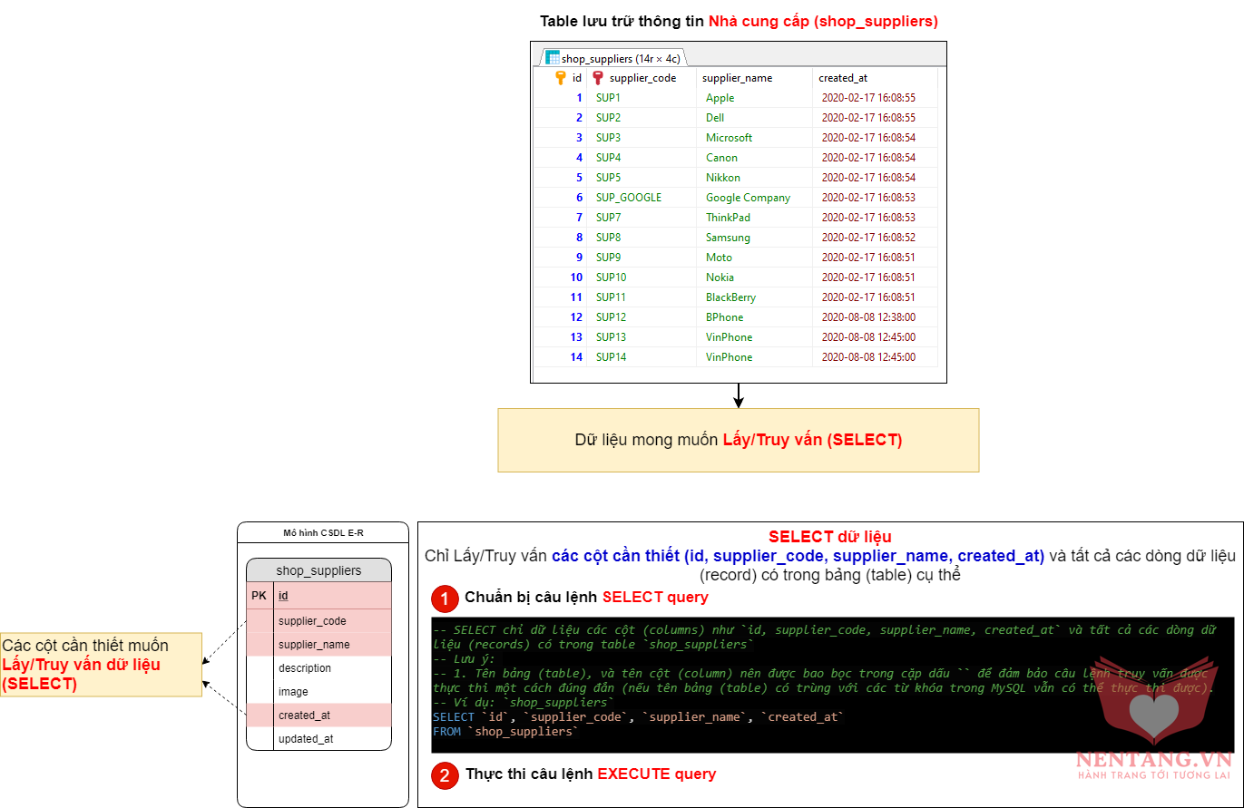 Ví dụ 2: chỉ Lấy/Truy vấn dữ liệu các cột id, supplier_code, supplier_name, created_atcó trong table shop_suppliers