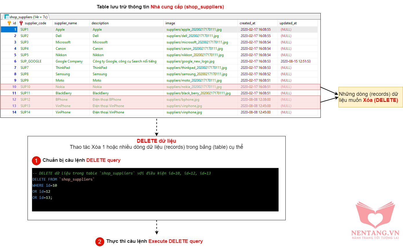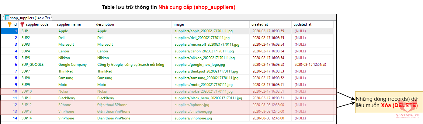 shop_suppliers theo điều kiện WHERE id=10, id=12, id=13shop_suppliers: