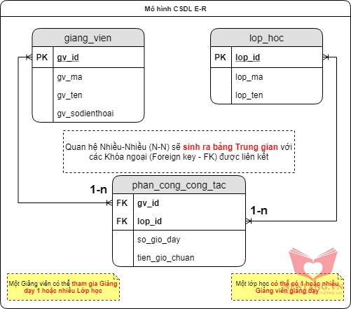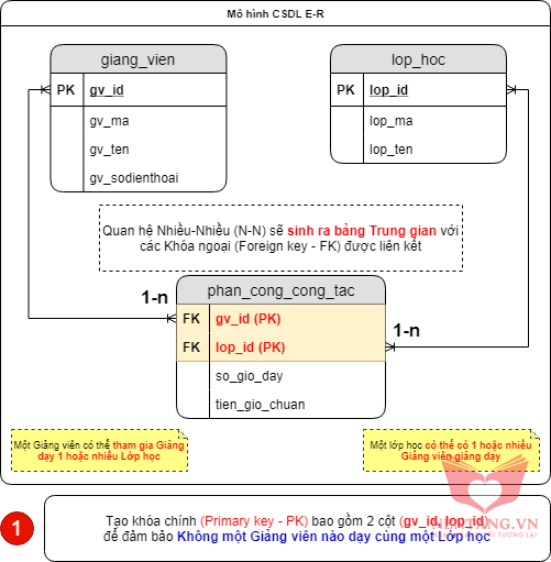 - Trong bảng (table) Trung gian sẽ có thêm các cột dùng để lưu trữ thông tin bổ sung/làm rõ nghĩa Mối quan hệ Nhiều - Nhiều (N-N). Tuy nhiên, các cột này không bắt buộc (tùy vào thiết kế của bạn)