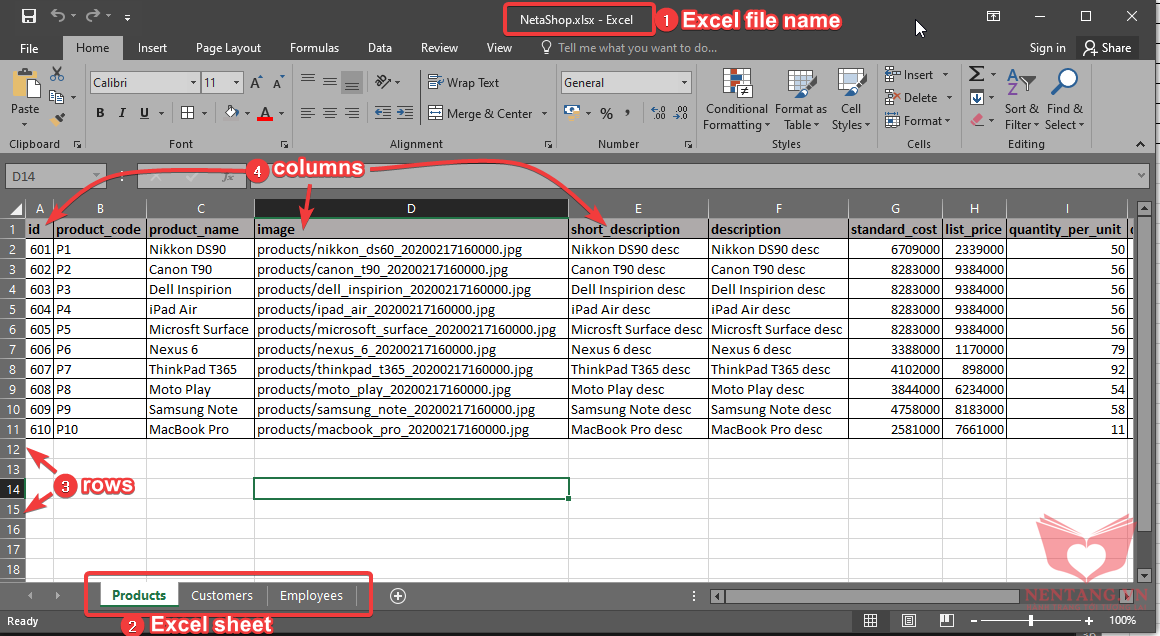 Chúng ta có file Excel và Database dùng để lưu trữ thông tin dữ liệu bán hàng cho shop NetaShop như sau: