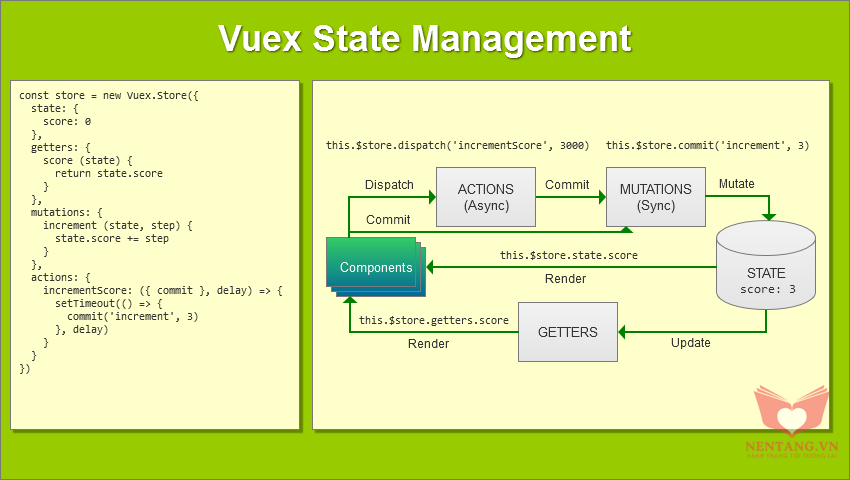 // Actions: là các hàm (methods) dùng để thực hiện các hành động thay đổi giá trị bên trong KHO chứa (store)