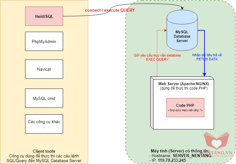 MySQL Server của bạn đang được khởi động (mở XAMPP để kiểm tra).Host/IP, Username/Password để truy cập đến Server
