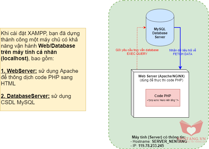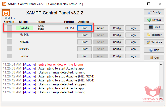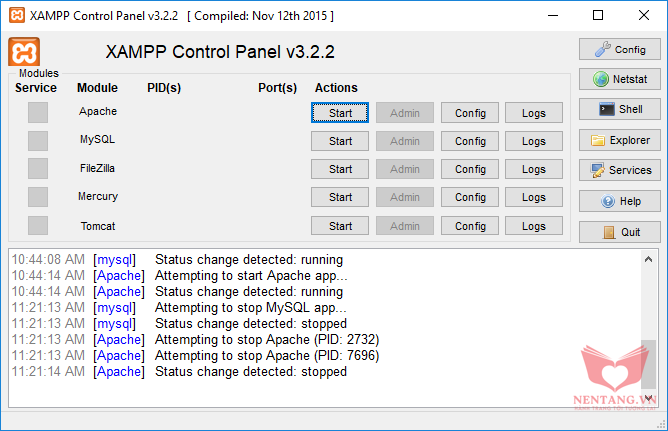 Web Server Apache:XAMPP, bấm Start dịch vụ Apache. Nếu thấy chấm màu xanh hiển thị thì bạn đã start dịch vụ Apache thành công.