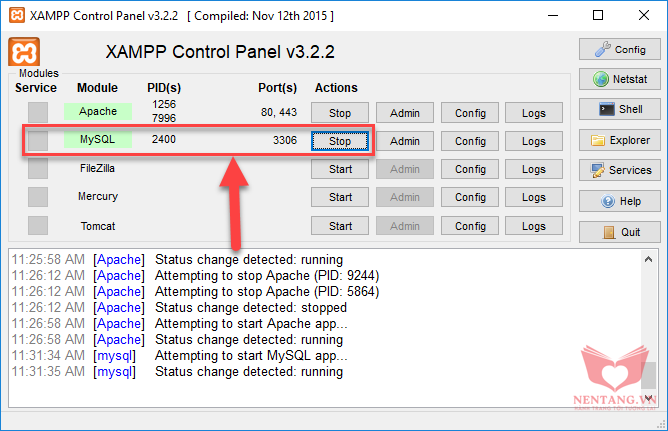 3. Khởi động dịch vụ MySQL Server:XAMPP, bấm Start dịch vụ MYSQL. Nếu thấy chấm màu xanh hiển thị thì bạn đã start dịch vụ MYSQL thành công