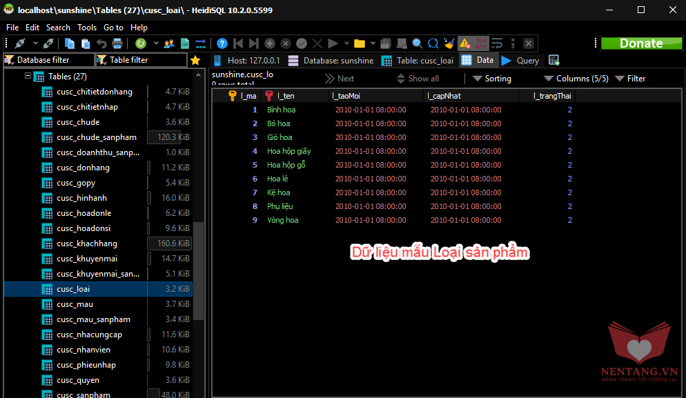 Step 5: sử dụng HeidiSQL hay PhpMyAdmin để kiểm tra xem table Loại có dữ liệu ban đầu đúng với code trong file SEED hay không?