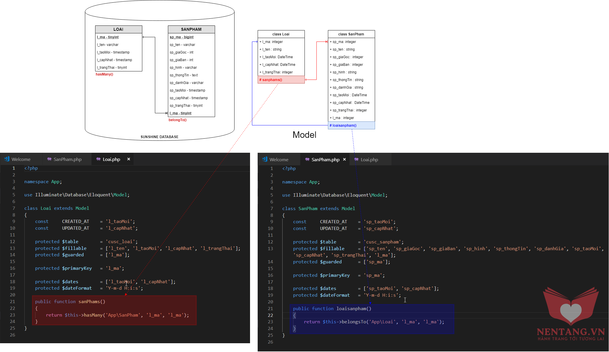 Hiệu chỉnh MODEL Loai.phpsanphams(), dùng để trả về danh sách các dòng dữ liệu (records) SanPhampublic function sanPhams()