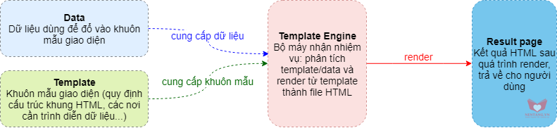 dữ liệu (data) và khuôn mẫu giao diện (template), bộ máy template engine sẽ thực hiện thao tác hòa trộn/xuất (render) từ khuôn mẫu giao diện (template) thành file HTML để trả về người dùng.