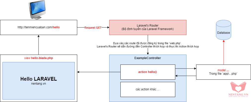 hello():hello() thường dùng để hiển thị màn hình chào mừng với chữ HELLO LARAVELapp/Http/Controllers/ExampleController.php<?php