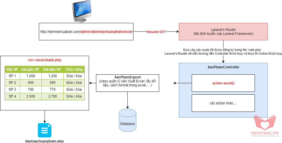 - Đường dẫn URL là đường dẫn được tạo ra bằng route có tên `admin.sanpham.excel`