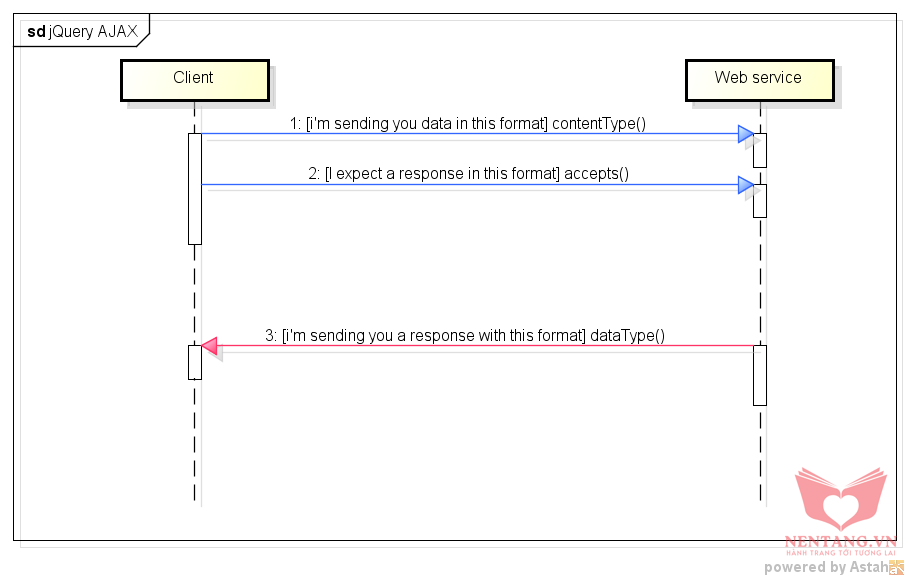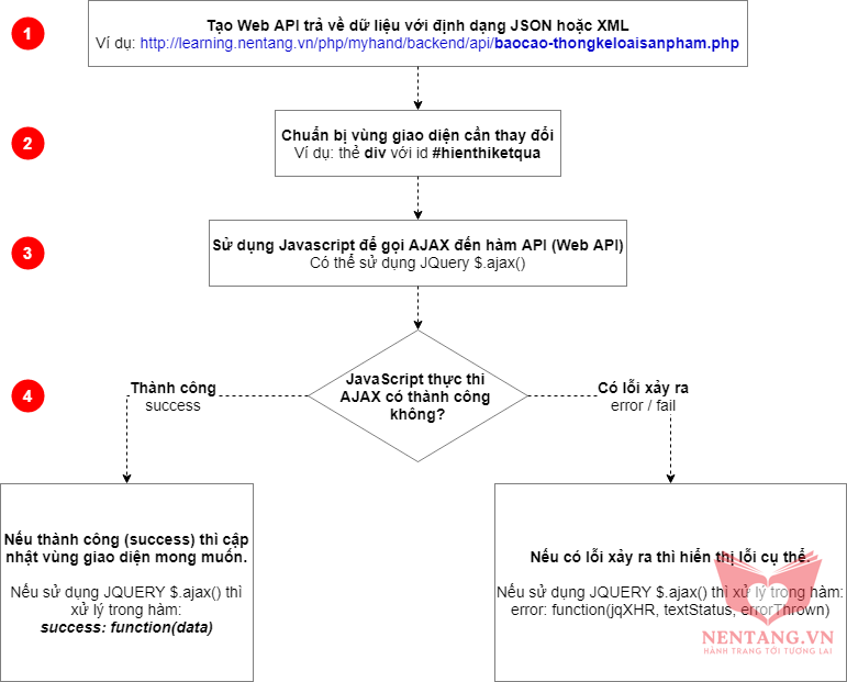 $.ajax để gởi yêu cầu (Request GET/POST) đến Web API.success: function(data): là hàm dùng để xử lý khi JQUERY gọi AJAX thành công đến API và lấy được dữ liệu mong muốn. Trong hàm này, chúng ta sẽ lấy dữ liệu và hiệu chỉnh HTML trên giao diện theo ý muốn.error: function(jqXHR, textStatus, errorThrown): là hàm dùng để xử lý khi JQUERY gọi hàm AJAX bị lỗi. Trong hàm này, chúng ta sẽ hiển thị thông báo lỗi...Content Type và Data Type