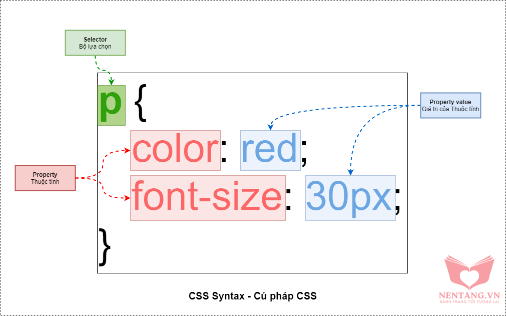 selector: bao gồm các cú pháp để có thể chọn đúng phần tử (element) mong muốn định dạng.