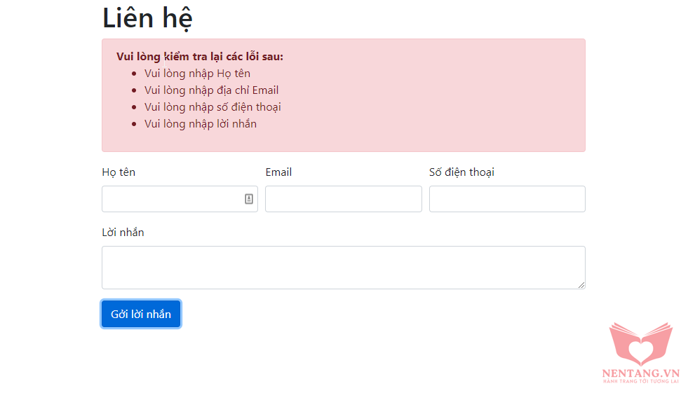Sử dụng VueJS và Bootstrap để tạo trang Liên hệ (contact) có các Ràng buộc kiểm tra dữ liệu như sau: