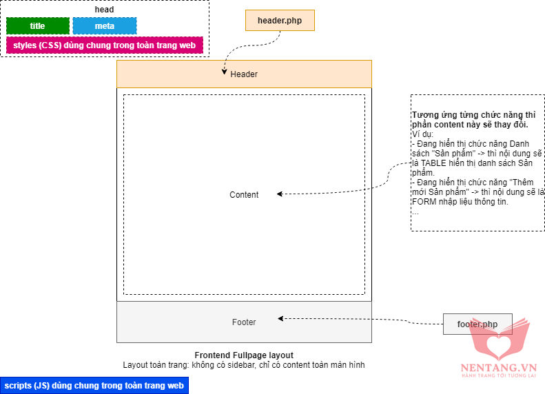 Header: đây là phần đầu của trang web, thường sẽ chứa thanh navbar để điều hướng đến các chức năng.Content: đây là vùng nội dung chính của trang, thường sẽ thay đổi tùy theo chức năng.Footer: đây là phần chân trangheader, footer. Chỉ phần content sẽ thay đổi tùy theo chức năng mong muốn.